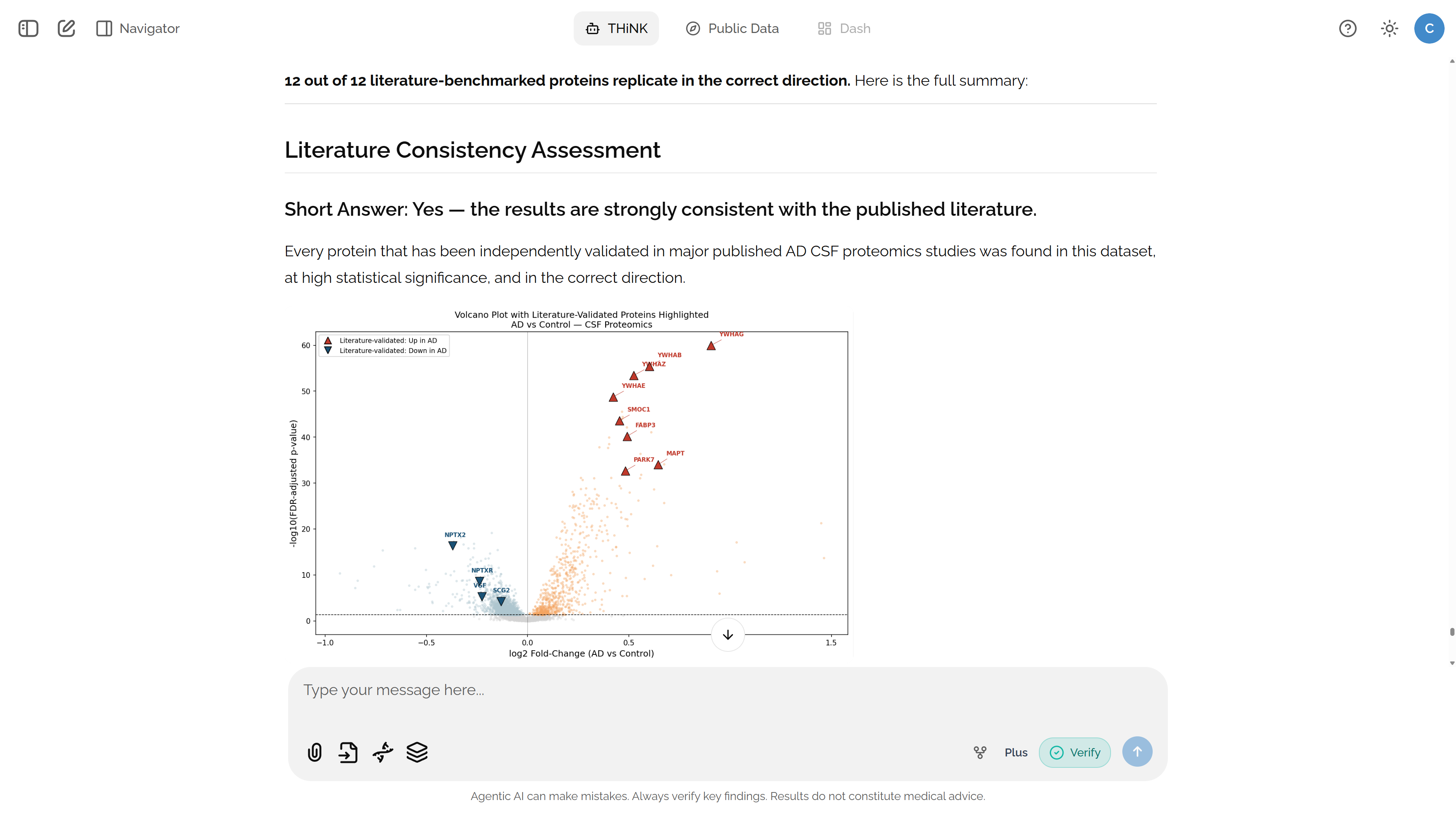 Not a chatbot. A research collaborator. Ask any question in plain language and THiNK reasons on top of your DASH data, synthesizing the published literature, running custom analyses, and verifying every claim before it answers.