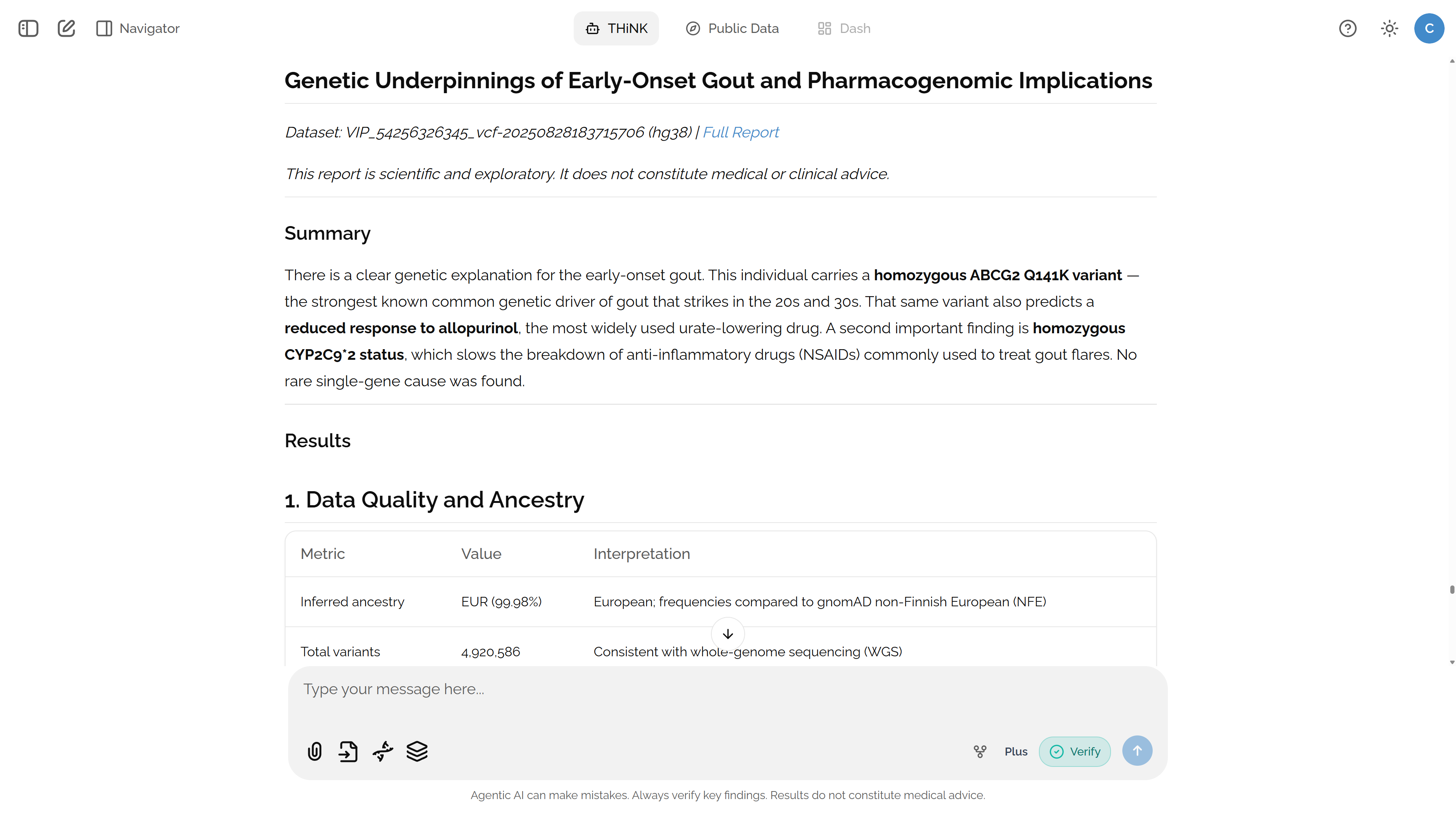 From publication-ready cohort analysis to understanding what your own DNA says about drug metabolism with the same grounded agentic AI to power it all.