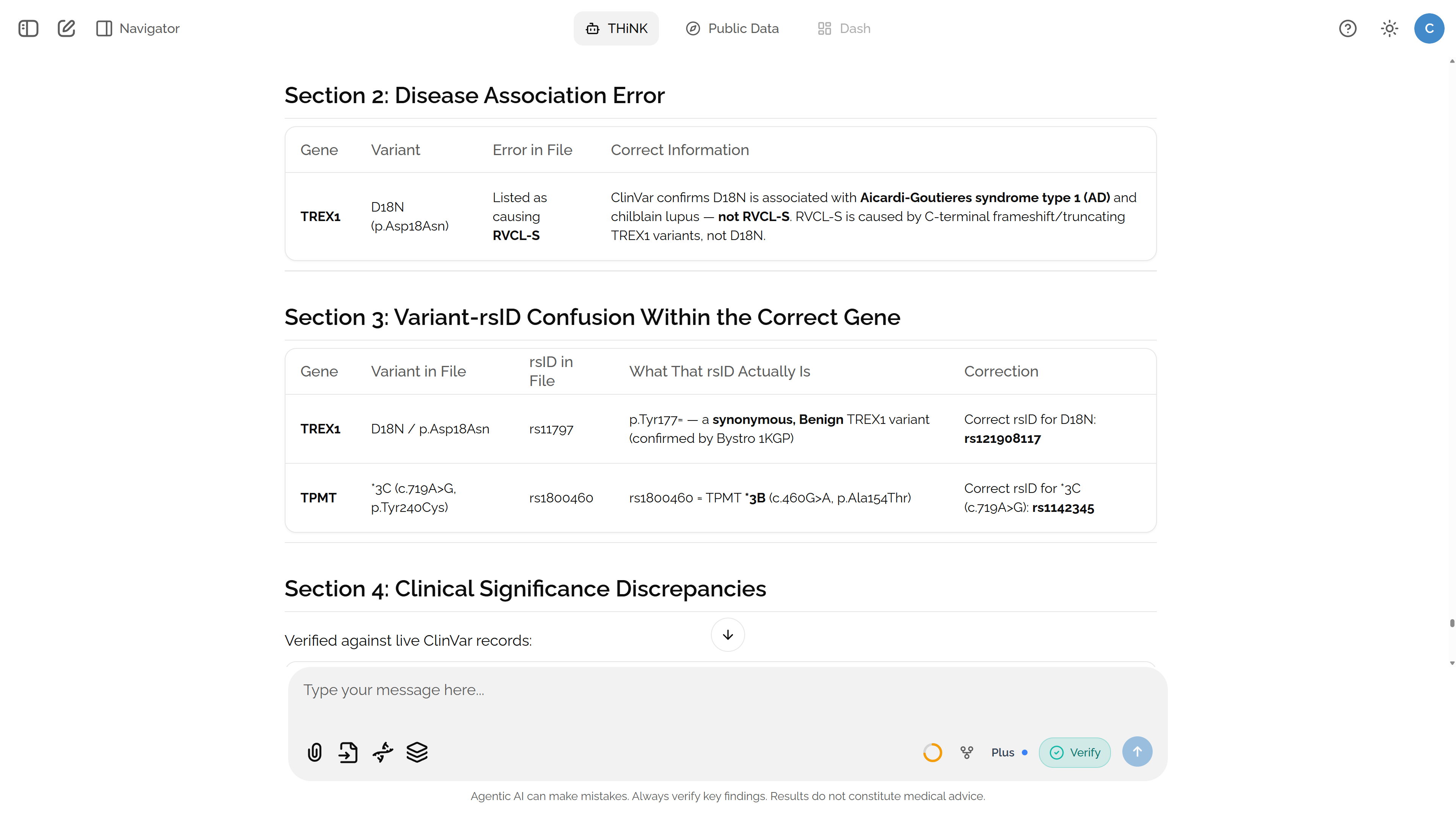 DASH produces the grounded data layer: annotated, versioned, and reproducible. THiNK reasons on top of it. When THiNK surfaces a variant or finding worth a closer look, jump to DASH to verify it against the raw annotation and bring that context back into your conversation.