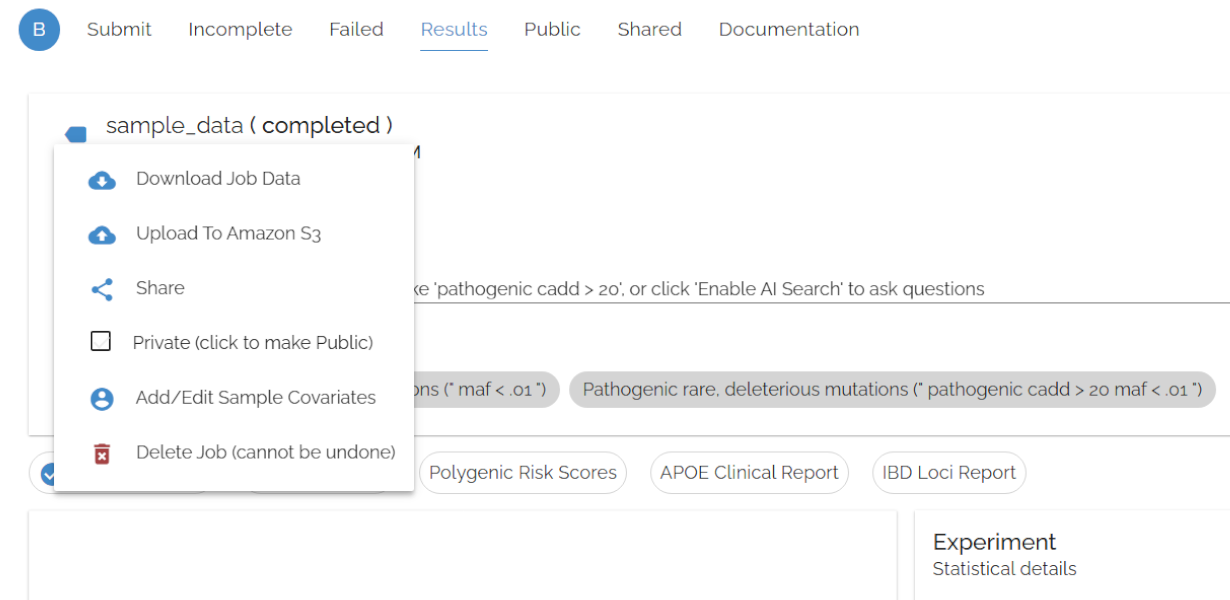 Once your annotation is complete, you can download your results, upload them to cloud storage, or manage them through the Bystro interface. Successful annotations appear in the Results page, while any issues are tracked in the Failed page.
