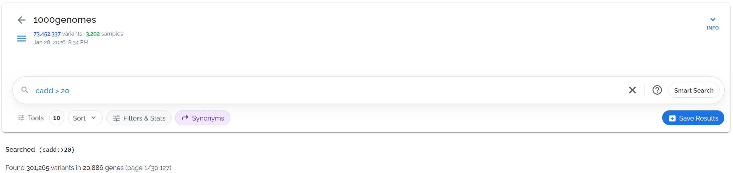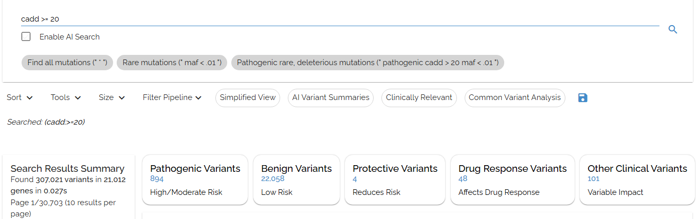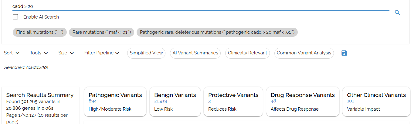 Search for variants with CADD scores greater than 20 usingcadd > 20: