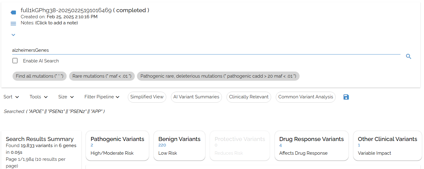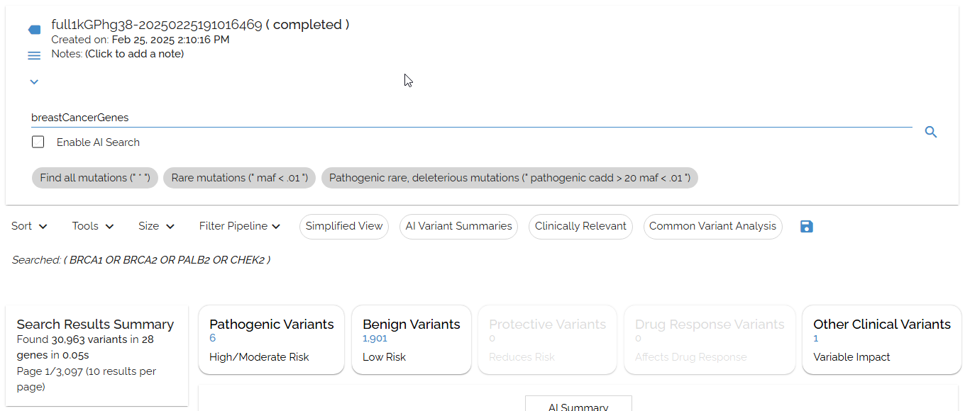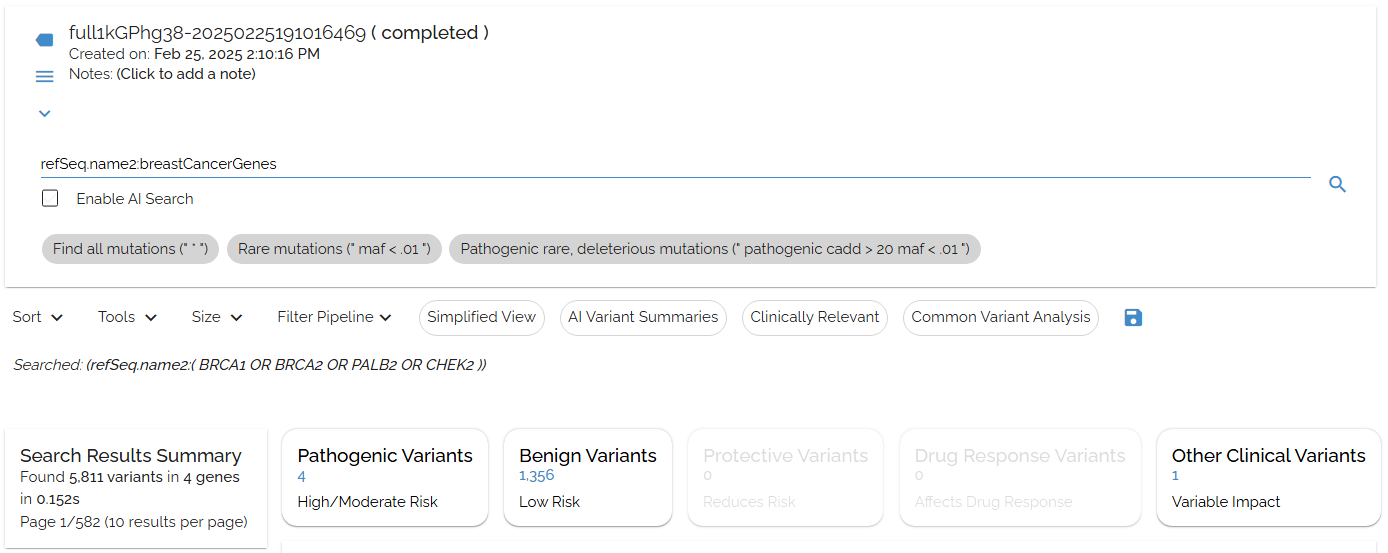 gnomad.genomes.af < 0.001clinvar.clinicalSignificance:Pathogeniccadd.phred > 20Exact Matching with Quotes