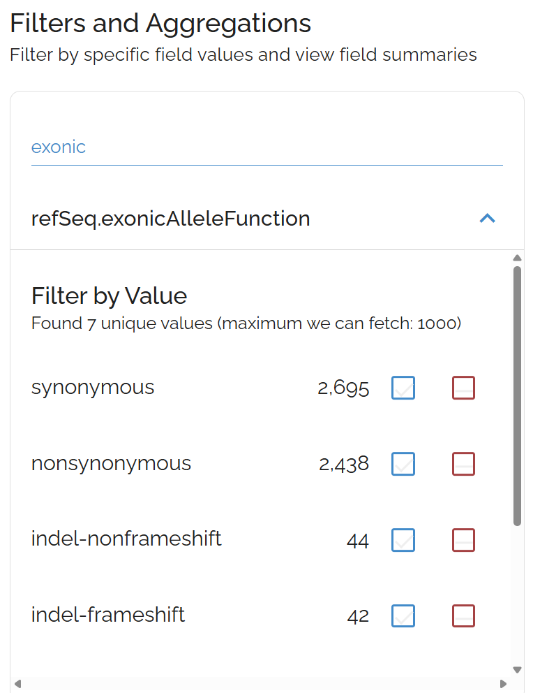 The filter toolbar helps you filter by individual annotation fields while showing result counts for each option. Use checkmarks (✓) to include specific values and minus signs (-) to exclude them.