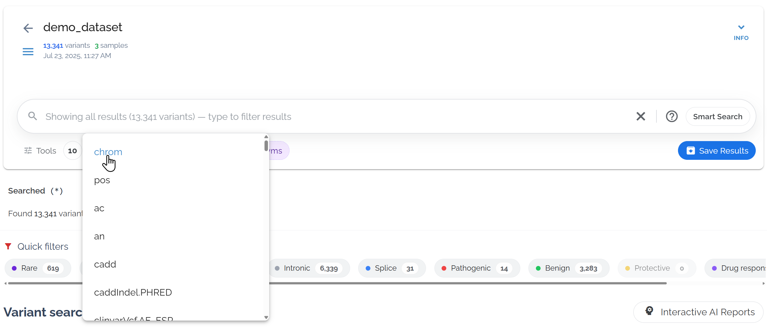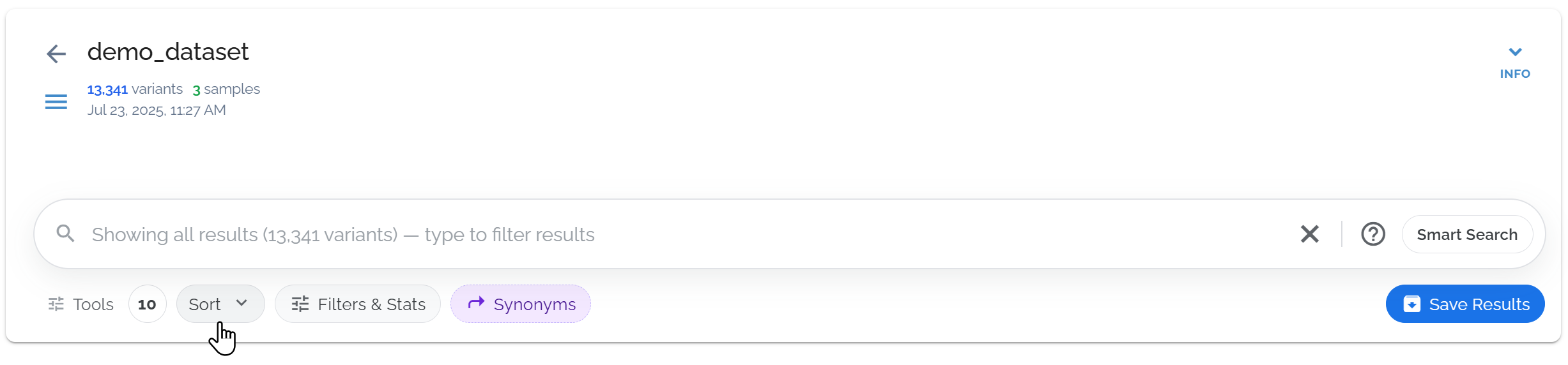 After filtering, use the Sort ⇅ button to organize your results by genomic position, functional impact, allele frequency, or quality scores.