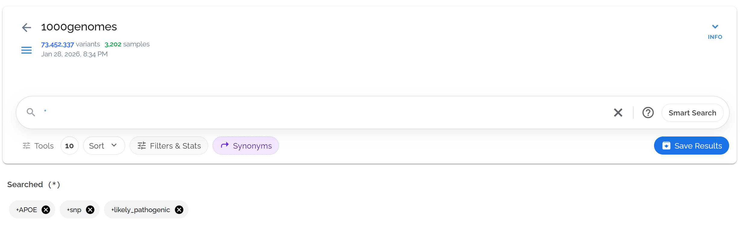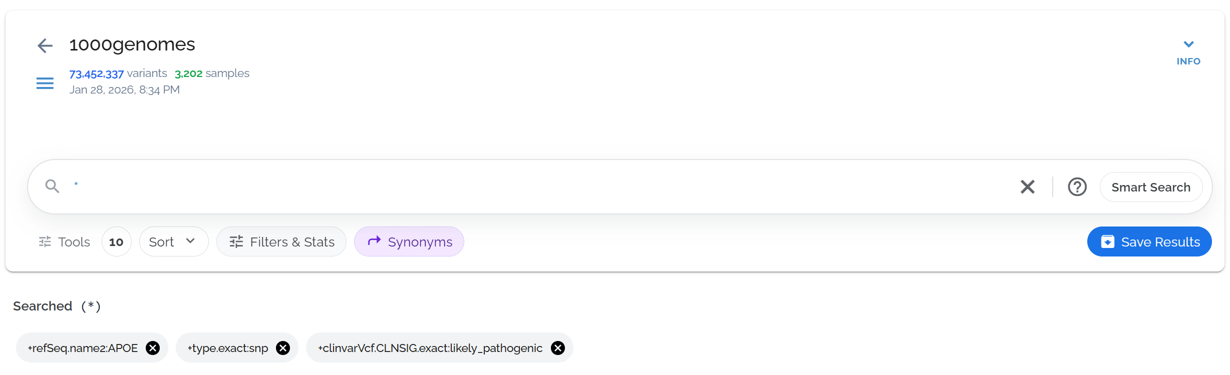Dataset used in examples: 1000 Genomes Project (73,452,337 variants in 27,192 genes, queries typically complete in ~0.5 seconds)