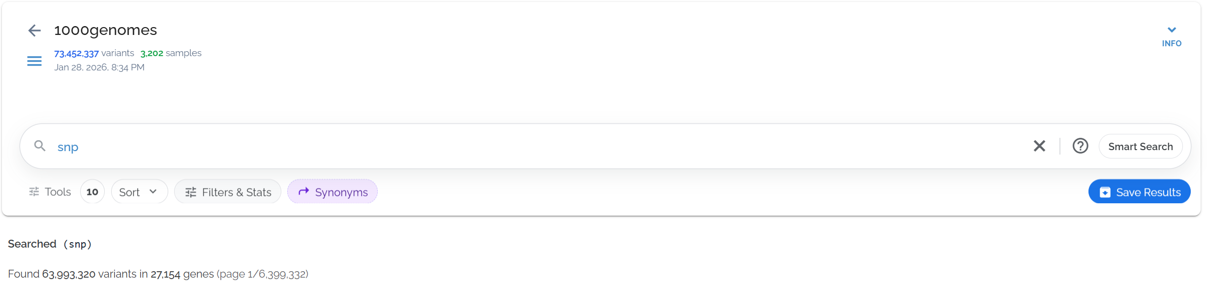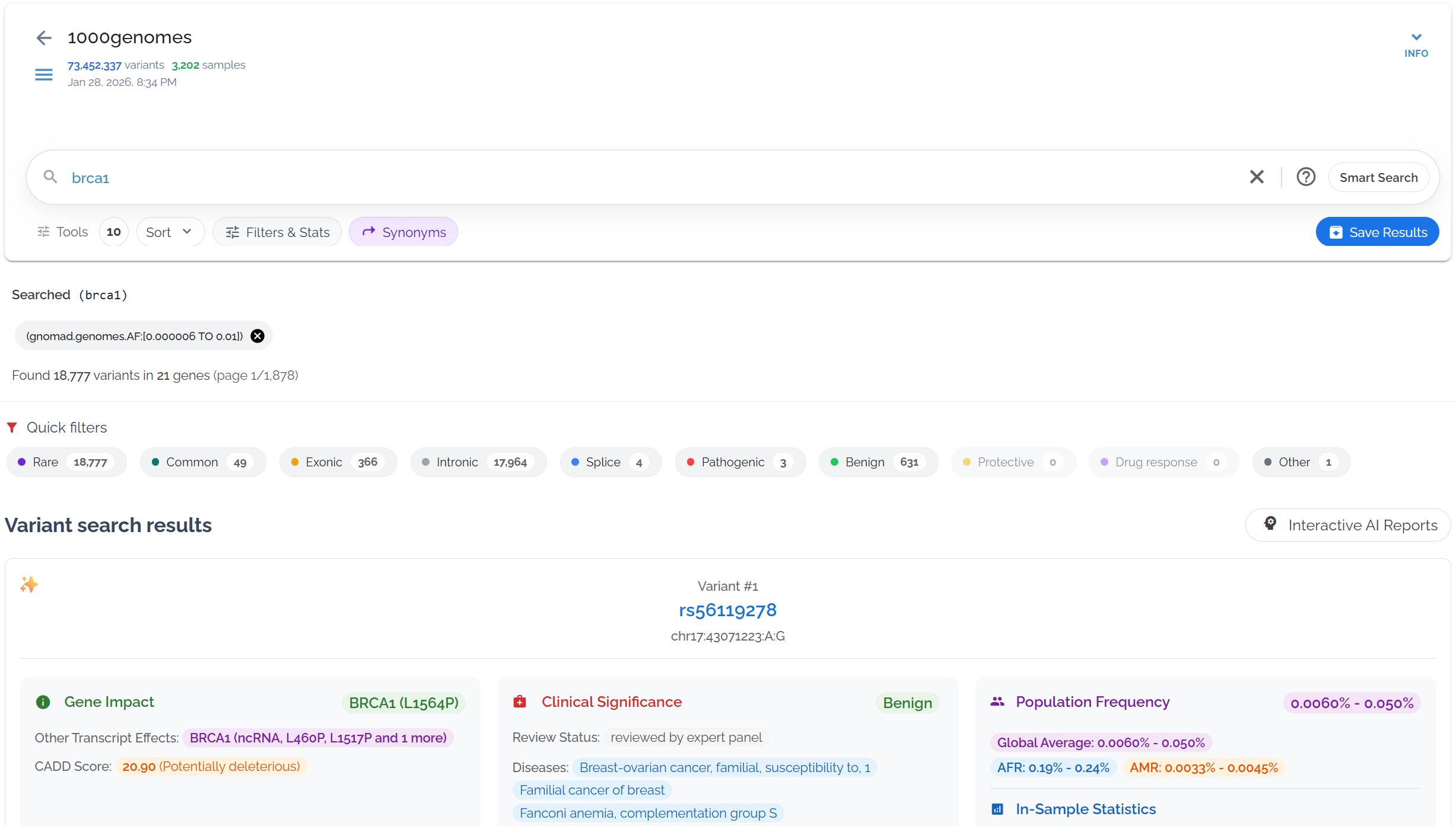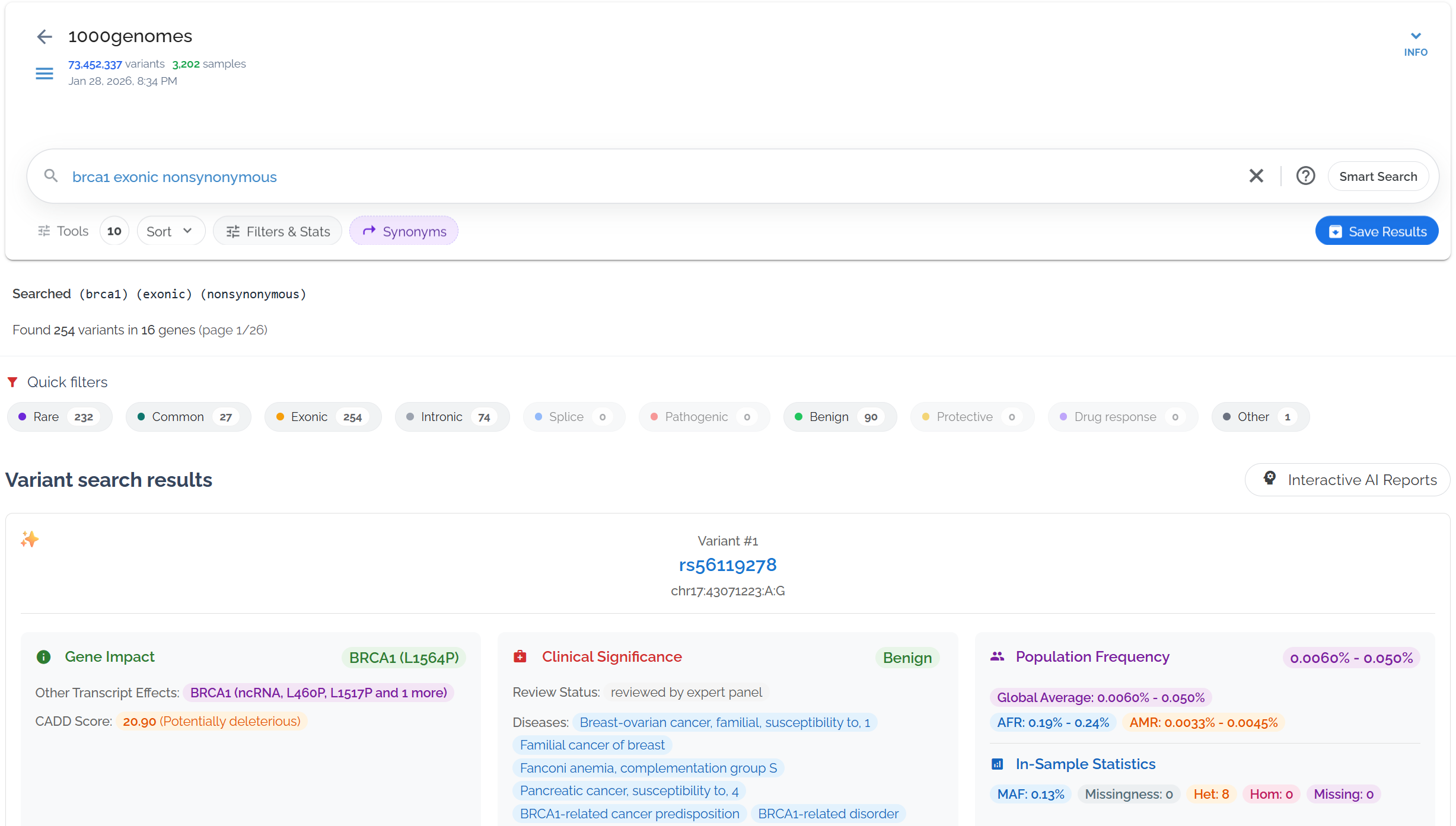Dataset used in examples: 1000 Genomes Project (73,452,337 variants in 27,192 genes, queries typically complete in ~0.5 seconds)